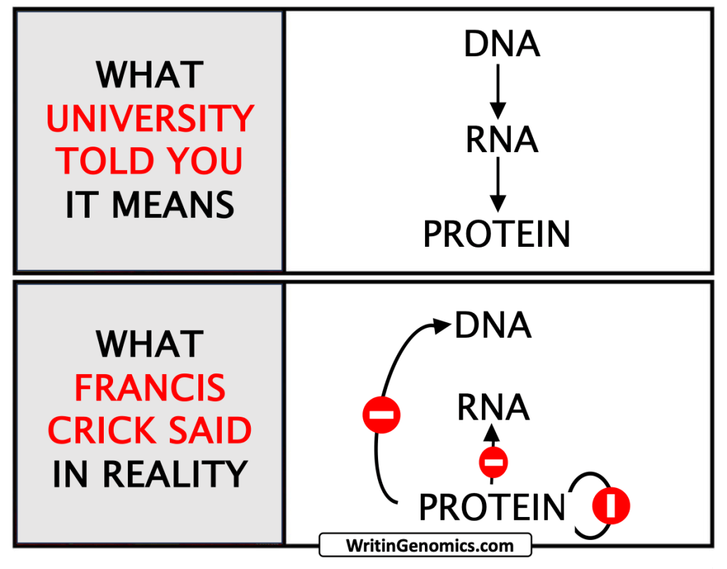 Like many of you, I believed I knew the Central Dogma of molecular biology: DNA→ RNA→Protein. I was wrong. Somewhat shocked, I learned what it really means only last week, after digging in a paper older than my dad – I am a sucker for the history of science…