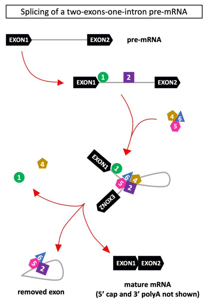 RNPs assemble in two complexes: the major spliceosome (formed by U1, U2, U4, U5, U6) and minor spliceosome (U11, U12, U4atac, U5, U6atac). The major complex intervenes in most instances, while the minor complex handles the removal of a rare (<1%) type of intron.